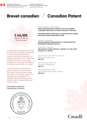 該發明于2021年5月獲國內發明專利授權,2022年9月陸續獲得國際授權,提出了一種綜采工作面測量機器人裝置和自動測量系統,測量機器人組成部分包括:吊籠、全站儀、棱鏡、工控機。將具備自動整平功能的吊籠固定吊裝在液壓支架頂梁上,然后將全站儀、工控機固定在吊籠中,最后將帶插接件的棱鏡和全站儀底座對接,形成一個測量機器人裝置。根據礦井綜采工作面起伏,沿綜采工作面依次布設多個測量機器人,且相鄰的測量機器人通視,構成礦井覆蓋綜采工作面的自動測量系統。通過所述綜采工作面測量機器人裝置和自動測量系統實現了礦井綜采工作面固定和移動目標的精確大地坐標測量。