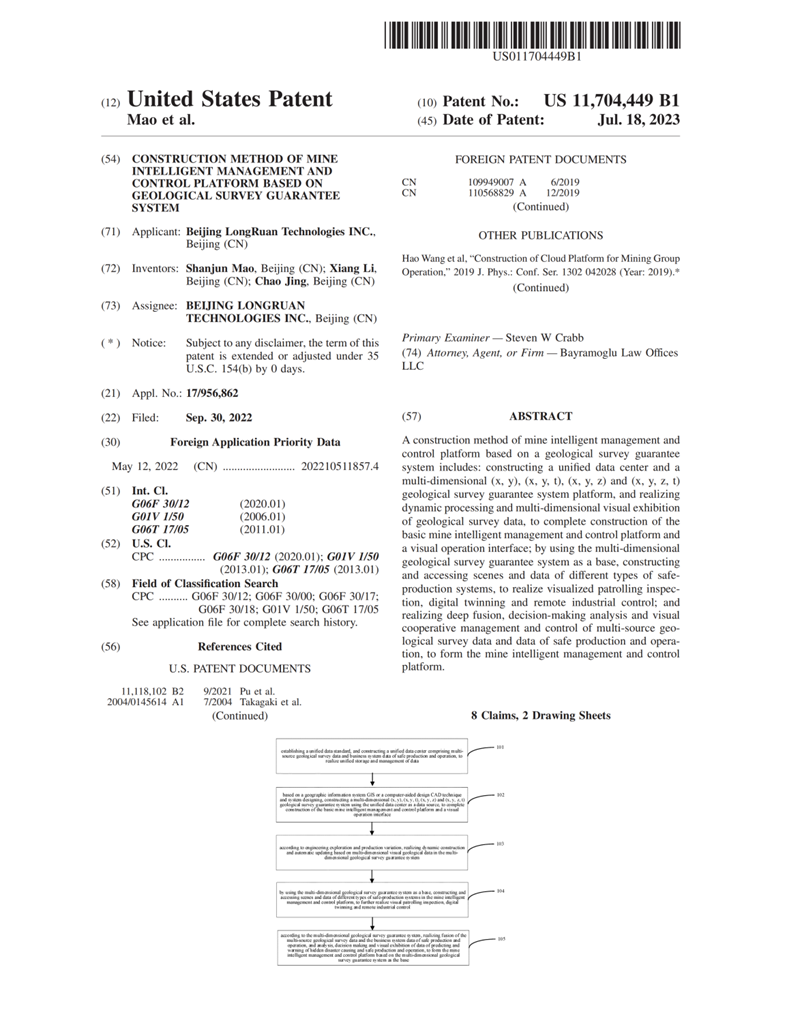 該發明于2022年8月獲得國內發明專利授權,2023年7月獲得國際授權,提出了一種基于地質測量保障系統的礦山智能化管控平臺建設方法:建立統一數據中心、多維(x,y)、(x,y,t)、(x,y,z)和(x,y,z,t)地質測量保障系統平臺,實現地質測量數據的動態處理和多維可視化展示,完成礦山智能化管控基礎平臺和可視化操作界面建設;以多維地質測量保障系統為基座,構建并接入各類安全生產系統場景和數據,實現可視化巡查、數字孿生和遠程工業控制;實現地測多源數據與安全生產經營數據的深度融合、決策分析與可視化協同管控,形成智能化管控平臺。本發明提出了以地質測量多維數據為基礎的智能化礦山管控新模式,實現了基于地質測量保障系統的礦山智能化管控平臺建設。