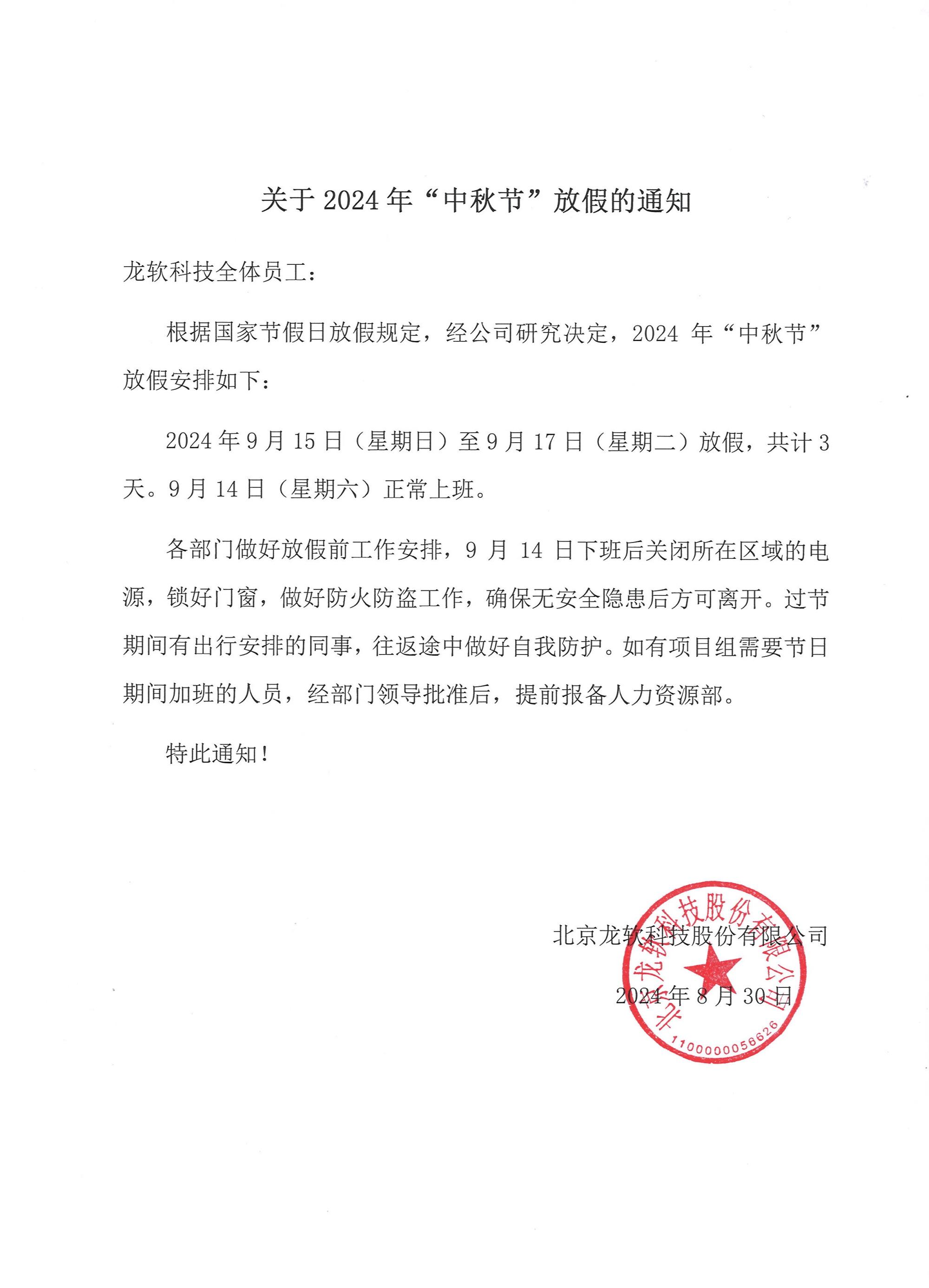 關于2024年“中秋節”放假的通知