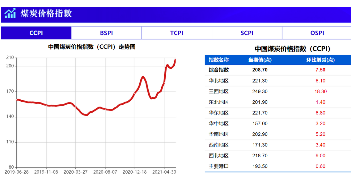 根據數據監測,本期中國煤炭價格指數(全國綜合指數)報收208.70點,環比上漲7.50點,環比漲幅3.73%。